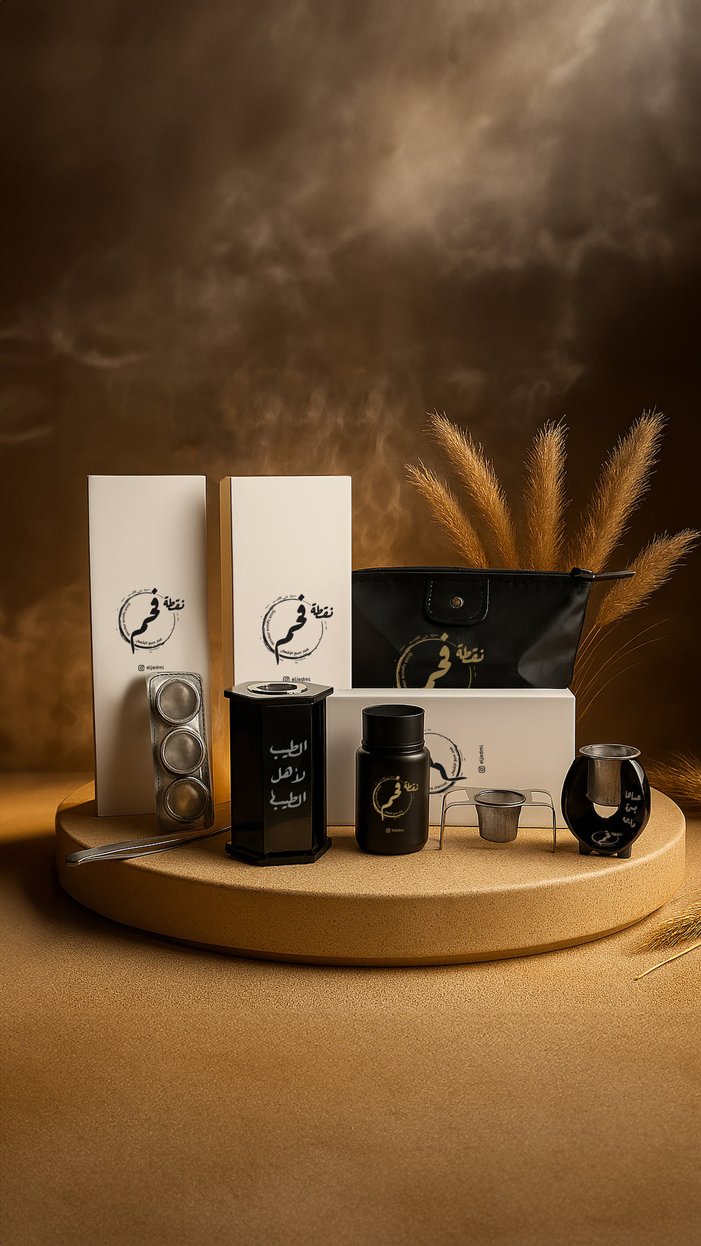 كل باقة تشمل 3 علب (360 قطعة فحم)، 3 مباخر ألمنيوم قابلة للطي، حقيبة، مبخر أكريليك صغير، علبة بلاستيكية لحفظ الفحم، ملقط، ومبخر رئيسي.